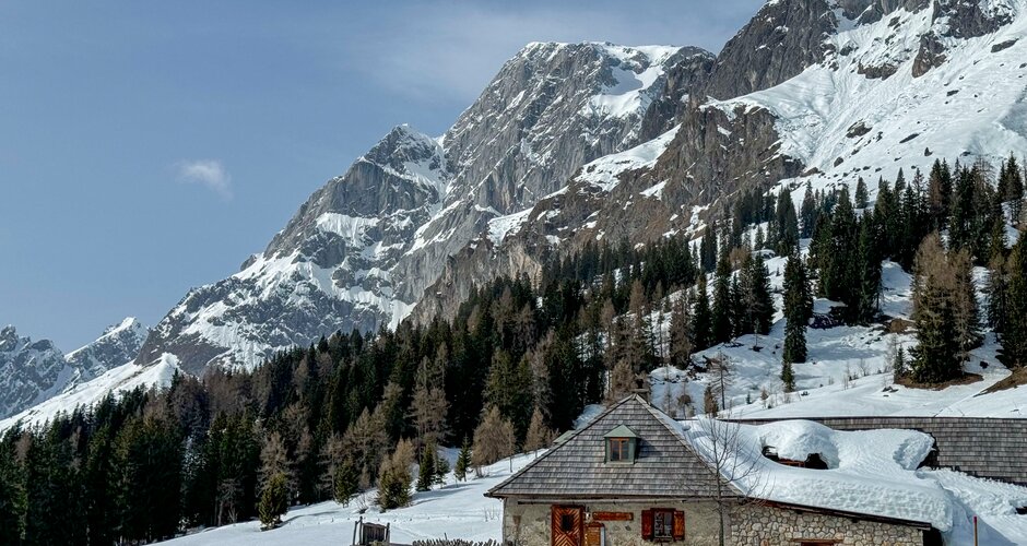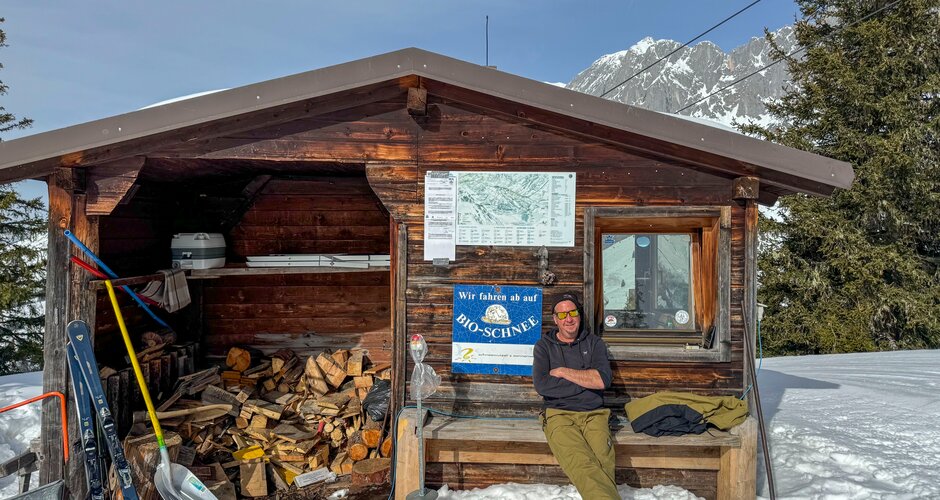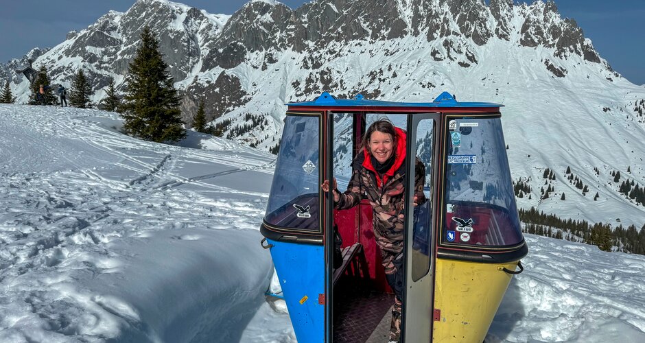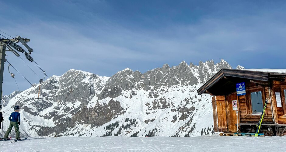 Den persönlichen Touch und das Herzblut, mit dem hier jede und jeder dabei ist, spürt man. Beim Ausstieg vom ersten Lift, dem Saukarlift, kommen wir direkt mit dem Liftler ins Gespräch. Er ist überzeugt: „Das ist der schönste Platz der Welt - neben den Seychellen!“ Und er gibt uns auch den genialen Tipp, vom Roßwieslift noch ein paar Meter Richtung Gipfelkreuz vom Hochkeil zu gehen. Dort erwartet uns eine großartige Kulisse: hinter uns das Hochkönigmassiv, vor uns ein Weitblick in alle Richtungen. Abgesehen von ein paar freundlichen, jausnenden Skitourengehern, absolute Ruhe hier oben.