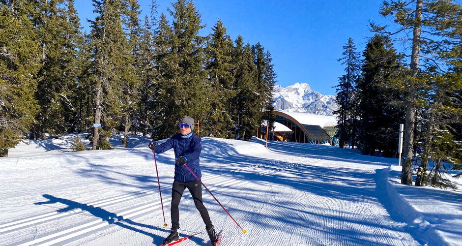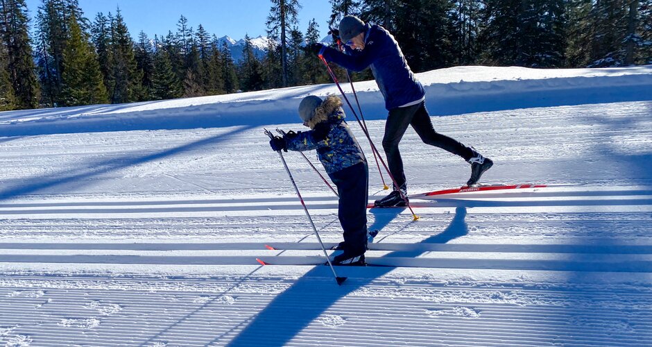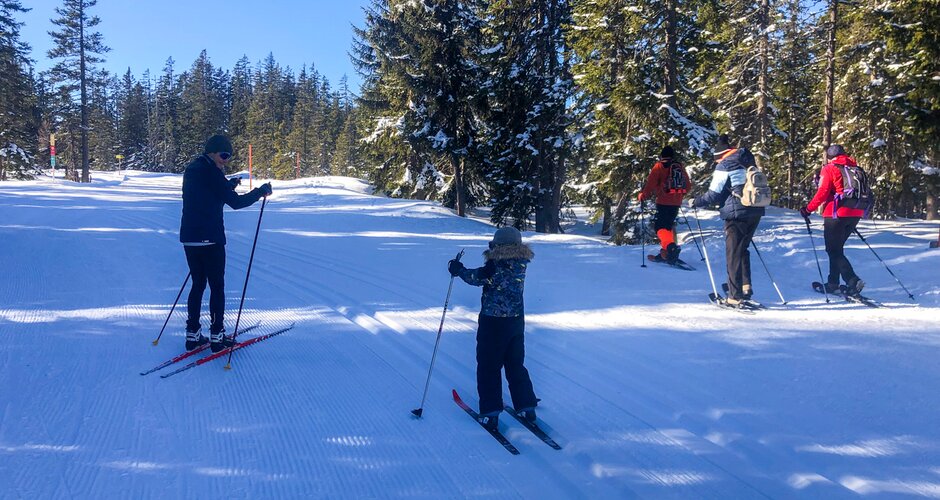 Oben angekommen sind Papa und Sohn direkt in die Loipe gestartet: Die super präparierte Höhenloipe auf 1.600 Metern Seehöhe ist im wahrsten Sinne des Wortes ein Highlight sowohl für gemütliche Anfänger wie auch für fortgeschrittene Langläufer. Und von der Aussicht auf ein herrliches Bergpanorama müssen wir gar nicht erst reden. Auch bei uns waren beide begeistert. Und beim nächsten Mal bringen wir auch Oma und Opa mit, denn direkt neben der Loipe können auch Winter- und Schneeschuhwanderer die Runde zum Rossbrand gehen.