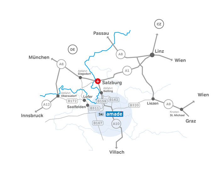 Sie erreichen Ski amadé über die Westautobahn A1 / Tauernautobahn A10 oder über die Pyhrnautobahn A9 /Ennstalbundesstraße B320. Außerdem können Sie von Wien kommend über die Semmering Schnellstraße S6 und ab dem Knoten St. Michael über die Pyhrnautobahn A9 und das Ennstal zu uns kommen.