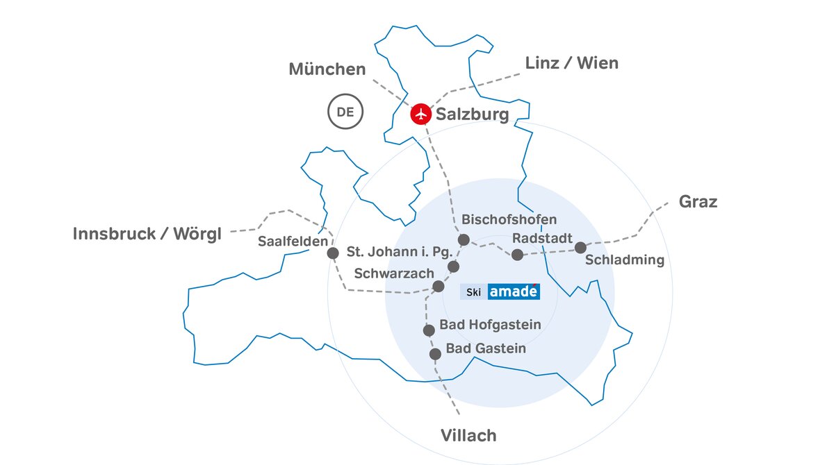 Mit der Bahn sind die fünf Regionen von Ski amadé via Westbahn (Deutschland) und Tauernbahn sehr gut erreichbar. Es gibt folgende acht wichtige Zielbahnhöfe in Ski amadé: Saalfelden| Schwarzach | St. Johann | Bischofshofen | Radstadt | Schladming | Bad Hofgastein | Bad Gastein