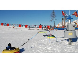 Kinderland mit Übungswiese, Kriechtunnel, Rutsche, Zauberteppiche und Karussel.
