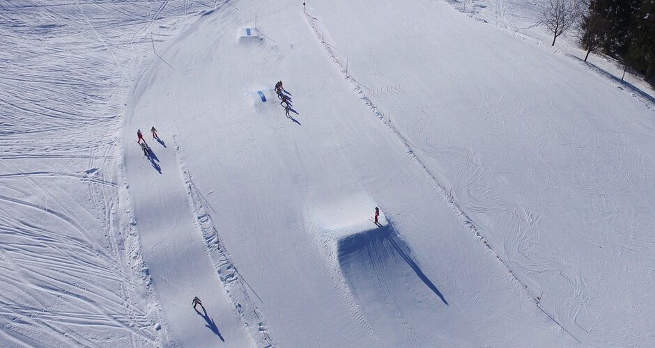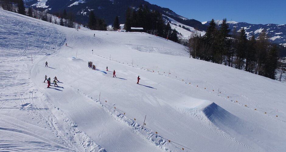 Ideal für Beginner, es erwartet Sie eine leichte Line mit 2 Boxen, einer Schanze und einer Wellenbahn. Fortgeschrittene können einen Sprung über die Showschanze der Skishow Maria Alm wagen.
