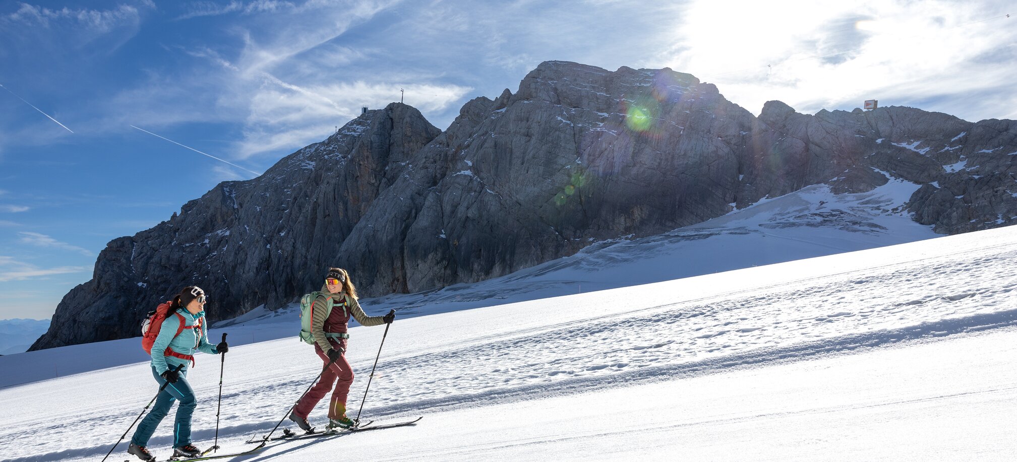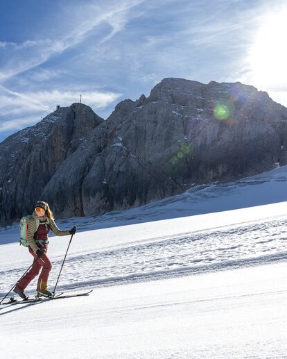 Umgeben von hochalpiner Landschaft geht es entlang der Ramsauer Loipe mit Blick auf den Rosmarie-Stollen zurück zur Dachstein-Bergstation, wo die Runde endet. Die Tour ist sowohl für Einsteiger als auch für erfahrene Skitourengeher geeignet.