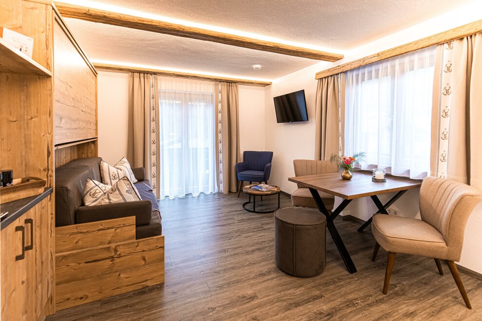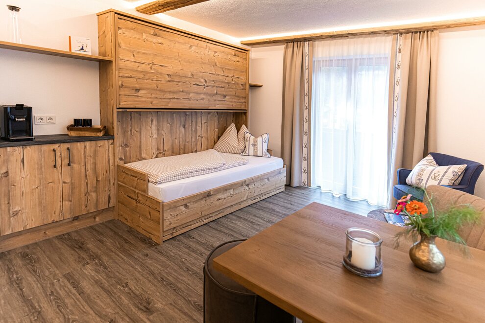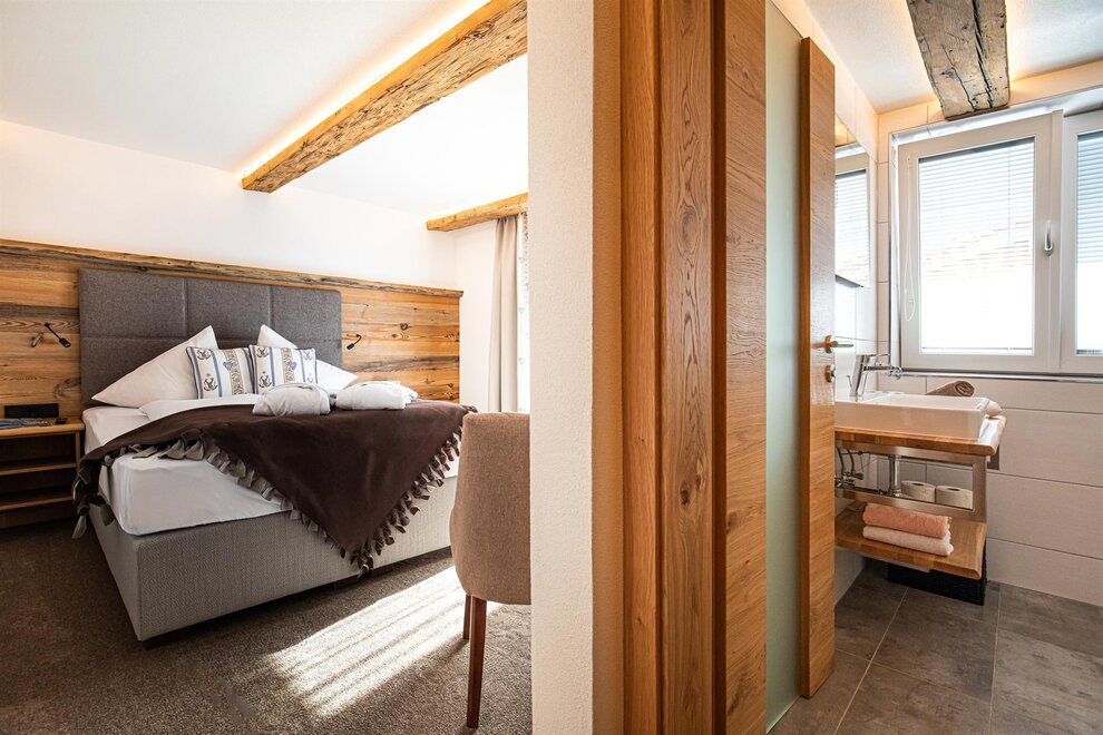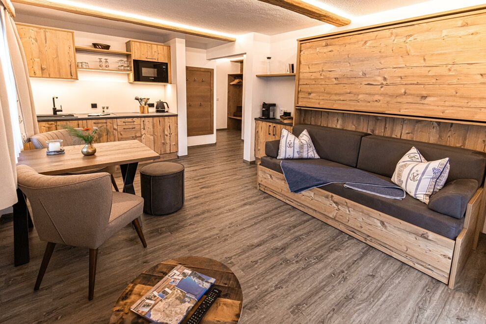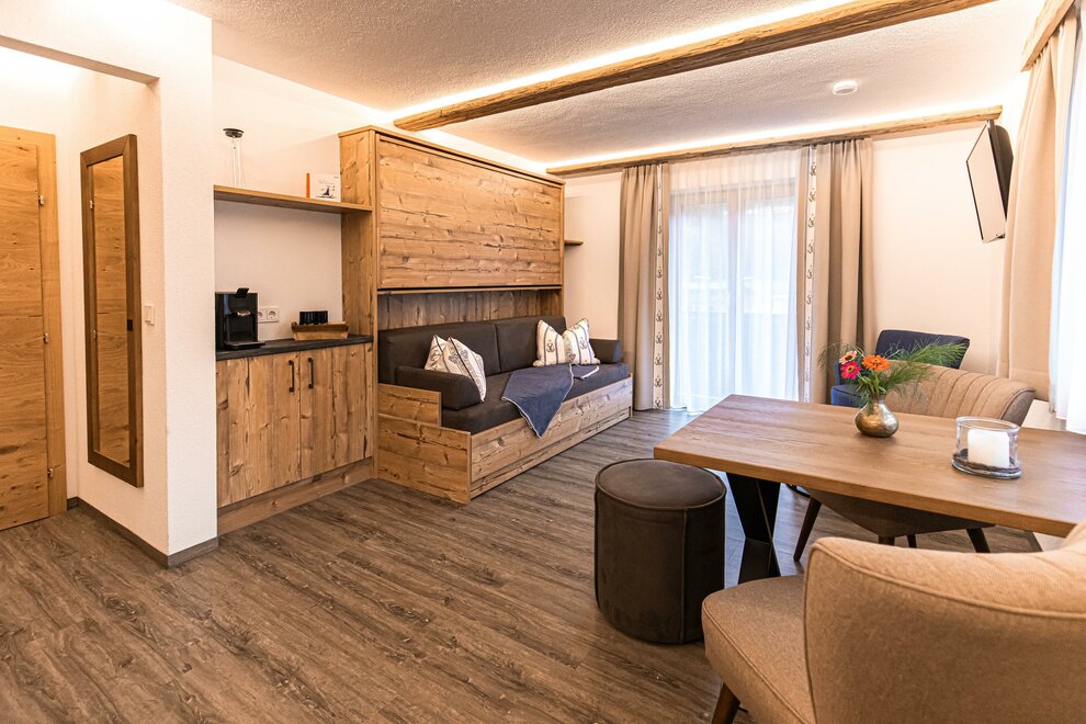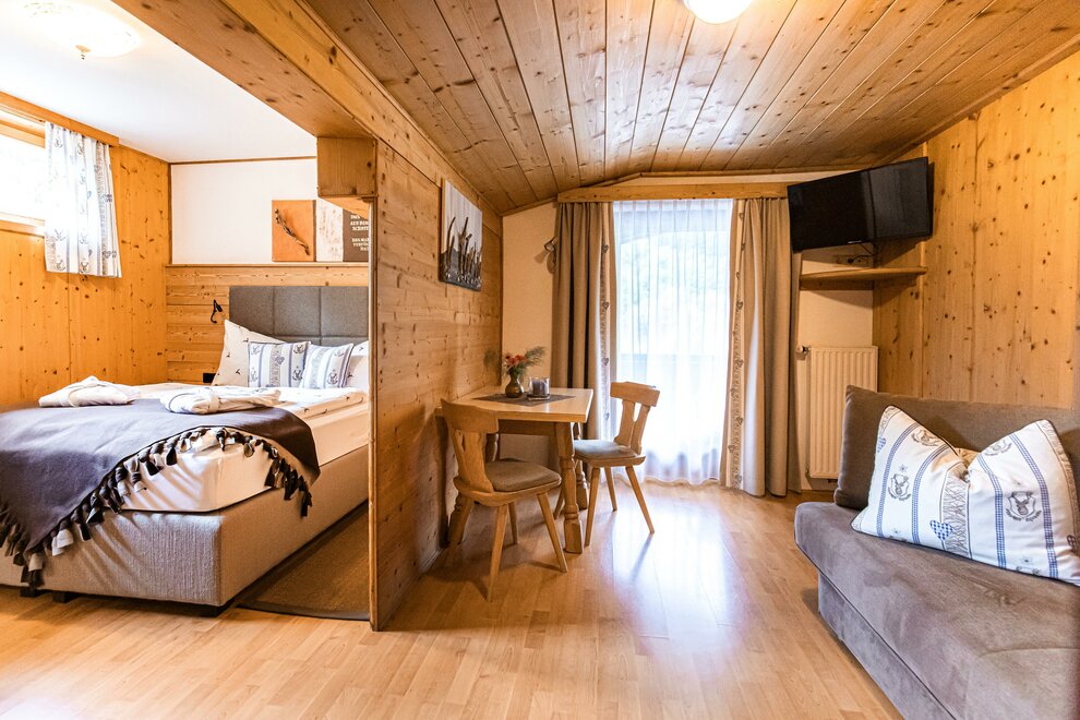 AlpineChic Suite, bedroom with a King Size box spring bed and living area with exclusive Flexino bed for 2 to 3 persons.