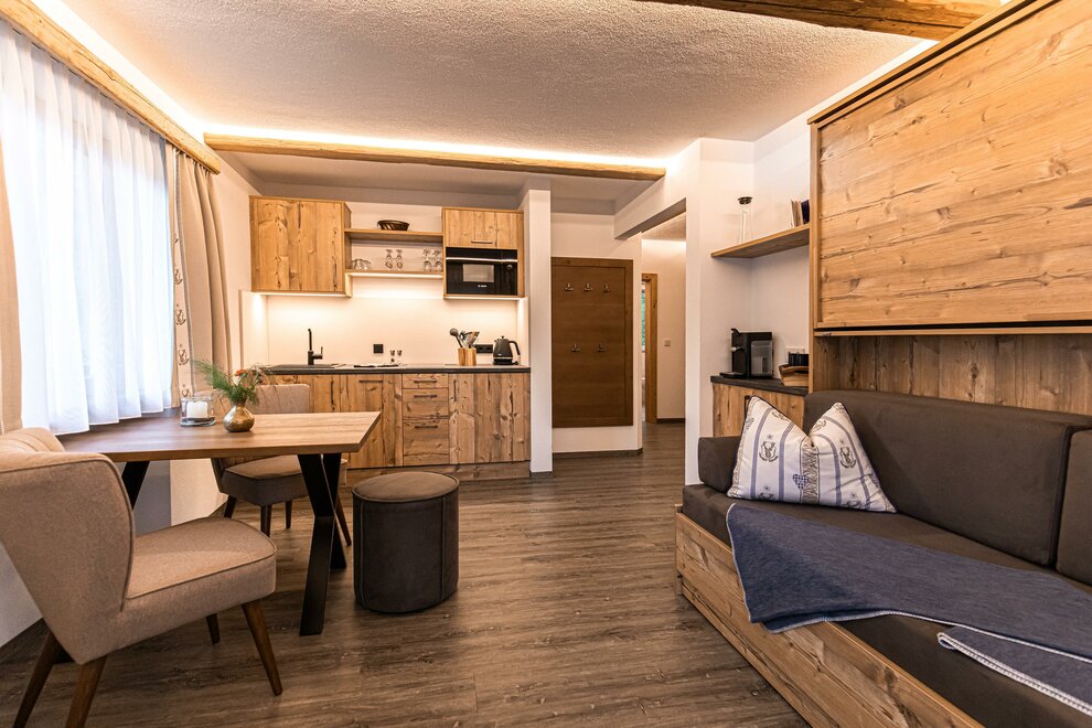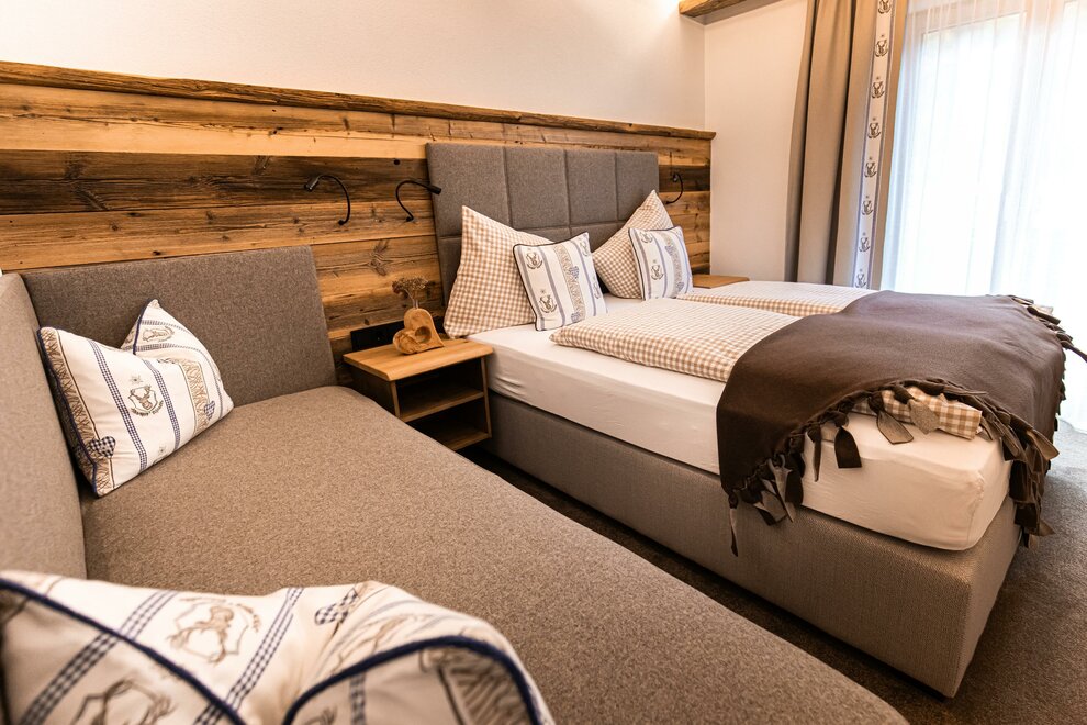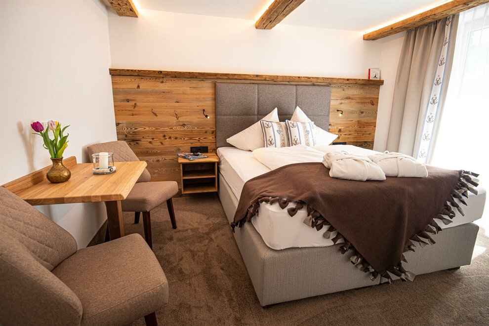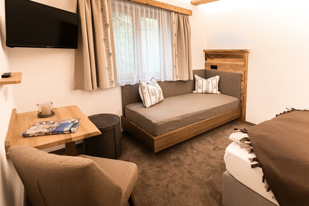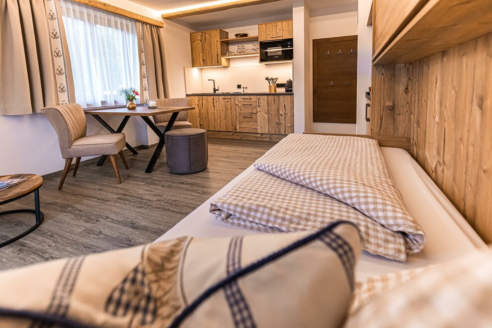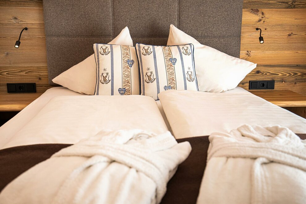 AlpineChic Suite, bedroom with a King Size box spring bed and living area with exclusive Flexino bed for 2 to 3 persons.