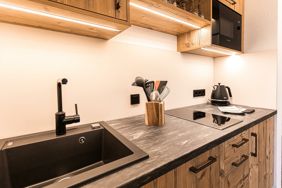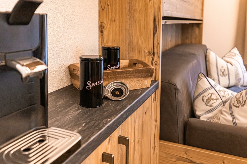 Kitchenette with dishwasher, 2 ceramic cooktops, microwave, Senseo coffee machine, and kettle