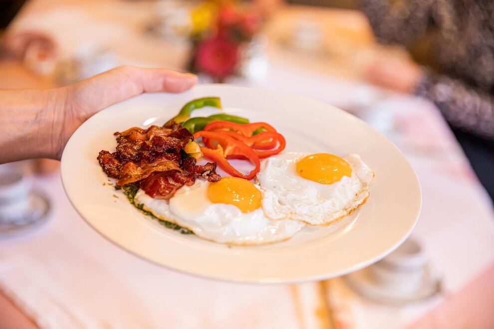 Ham and eggs, fried egg and scrambled eggs, freshly prepared on request
