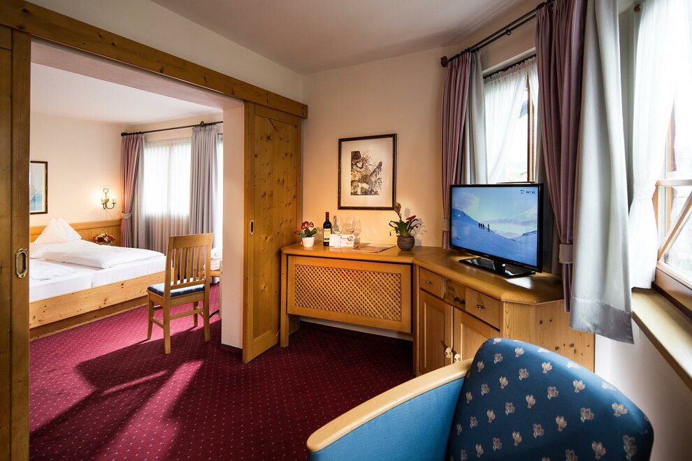 Nice hotel suits (2 sleeping rooms and living sleeping room) for 4 to 6 persons with bath, toilet, balcony, TV, safe, minibar, phone, internet and hair dryer.