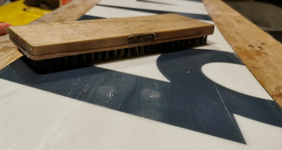 Now it's time to brush structure into the wax. Take a shoe brush or something similarly robust and brush your board in the opposite direction of travel. This will shape the board and make it ride faster and smoother in that direction. And now your snowboard is finished and ready to go.
