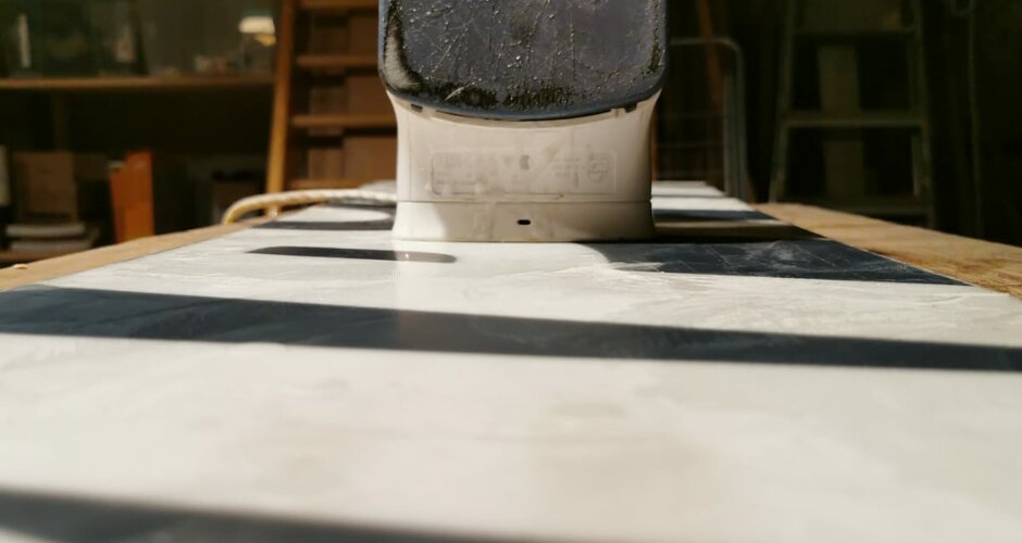 Before you start, you need a flat surface on which the snowboard cannot move. To avoid having to unscrew my bindings, I got an old pallet to keep the board in the air. Next you need to clean your board. A simple kitchen roll with acetone or brake cleaner will do. Just wipe it over the board thoroughly and we are ready to move on to the second step. That completes the first step.