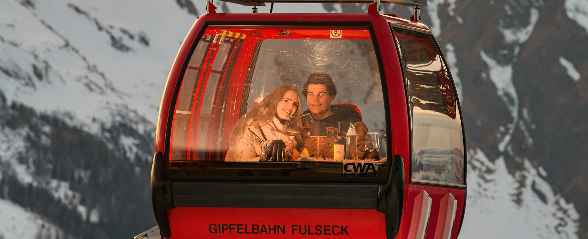 During the gondola dinner, you will travel through the idyllic mountain landscape at night on the Fulseck summit cable car while enjoying a delicious four-course meal.