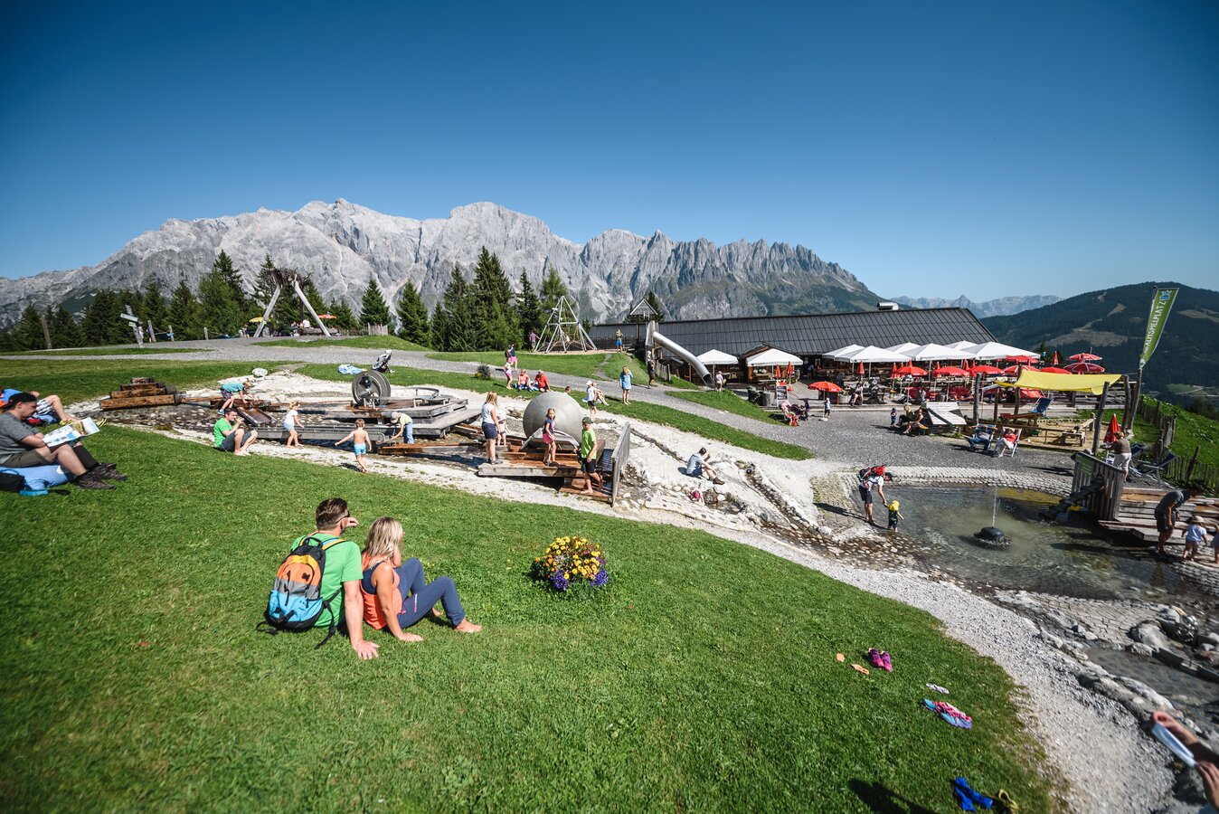 An absolute highlight for families is Toni’s Alpine Playground on the Hochkönig. Here, the mountain becomes a giant adventure playground: water and sand play areas for the little ones, a climbing tower, slacklines and activity stations, Alpine Frisbee for some playful action, relaxation and barbecue areas for a relaxing break, and the over 2km-long marble run trail.