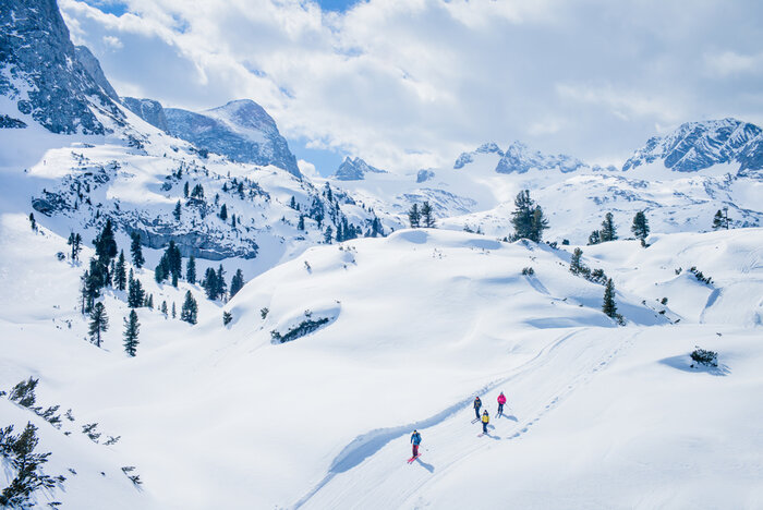 Powder or firn, narrow couloirs or wide slopes – the Edelgrieß offers countless variations. Depending on the line, the descent ends either at the Türlwandhütte and then continues to the valley station of the Dachstein Glacier Cable Car, or you can extend the fun via the Kramllahn to Ramsau.