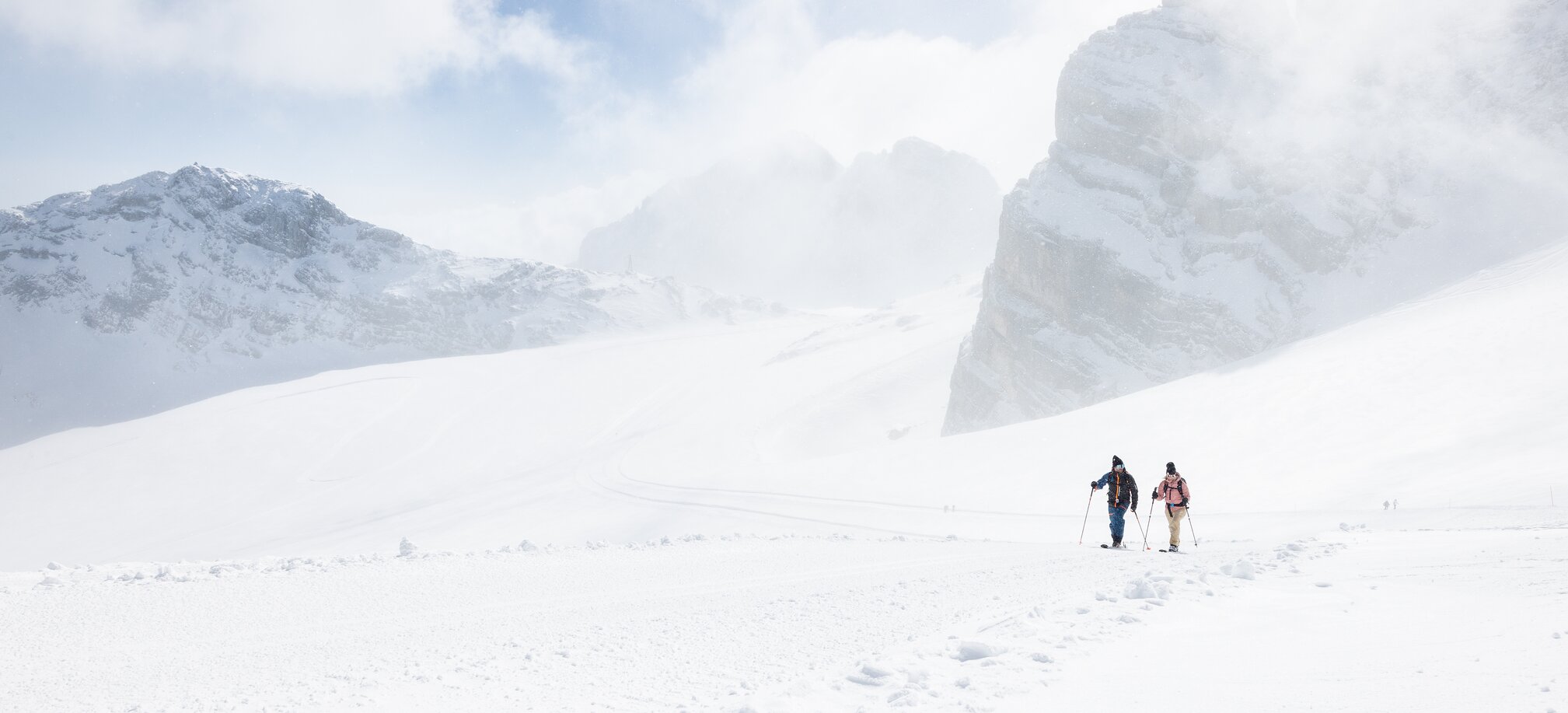 Two ski tourers ascend side by side through fresh snow under a cloudy alpine sky | © Harald Steiner