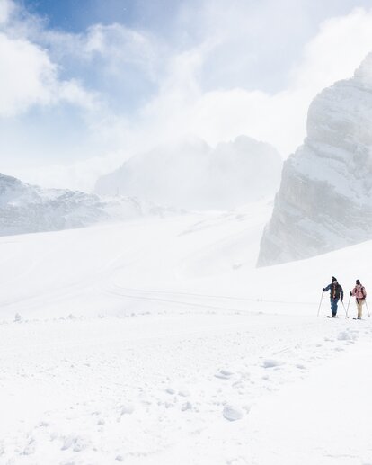 The return journey follows the same route. However, you share the trail with winter hikers on this section, which requires a little more caution. The last metres in altitude lead back uphill to the Dachstein mountain station, where the tour ends.